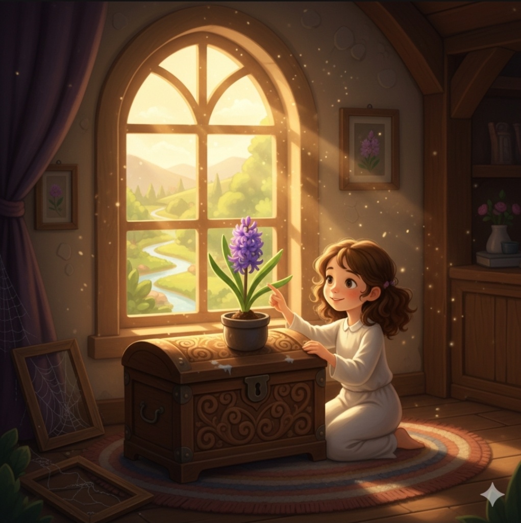 Can sandığın yanına yaklaşmış. Sandığın üzerinde, dedesinin amcasına hediye ettiği, ancak küslük yüzünden hiç sulanmadığı için kurumuş bir Mor Sümbül çiçeği varmış. Can, o kuru çiçeği de alıp, sandığın yanına, taze bir toprağa dikmiş.
