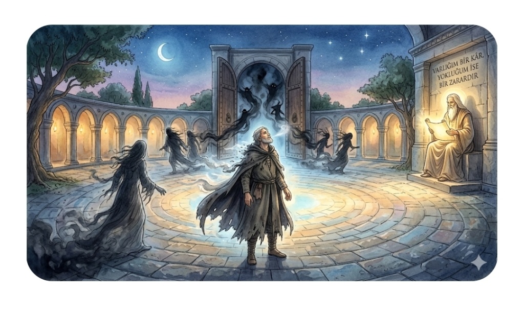 Meydanın en vakur köşesinde ise, hiç sarsılmadan duran bir Bilgelik yükselmiş ve o meşhur mührünü toprağa vurarak fısıldamış: “Varlığım bir kâr, yokluğum ise bir zarardır.” Bu söz, Yolcu’nun içindeki o titreyen ruhu ayağa kaldırmış. Kimseye bir diyet borcu olmadığını, sadece var oluşunun bile bu meydanı aydınlatmaya yettiğini ilk kez o an fark etmiş. Yolcu, artık pelerininin ağırlığından kurtulmaya karar vermiş; o sarsıntılı gölgeyle ve ona yük olan tüm yabancı silüetlerle tek tek helalleşmiş. Onları nazikçe meydanın dışına, kapıların ardına uğurladıkça, ruhunun toprağı nefes almaya başlamış. Kapılar kapandığında meydana yumuşak bir ışık süzülmüş; o eski baskı yerini derin bir ferahlığa, o sızılar ise ılık bir akışa bırakmış. Yolcu, Dünya’nın tam merkezinde durup başını göğe kaldırmış; çok yorgunmuş ama bu yorgunluk, bir düğümü çözmüş olmanın huzurlu ve mağrur yorgunluğuymuş. Artık meydanda ne bir ses ne de bir baskı kalmış; sadece kendi ruhunun o eşsiz ve özgür şarkısı yankılanıyormuş.